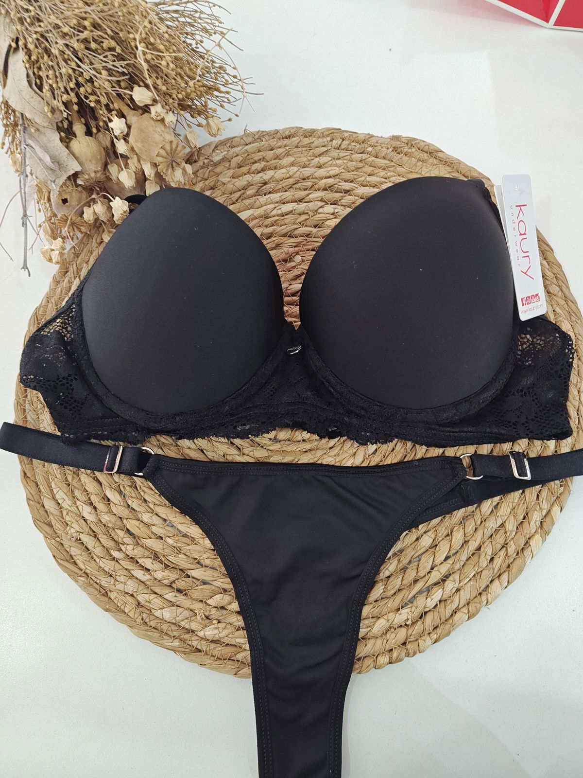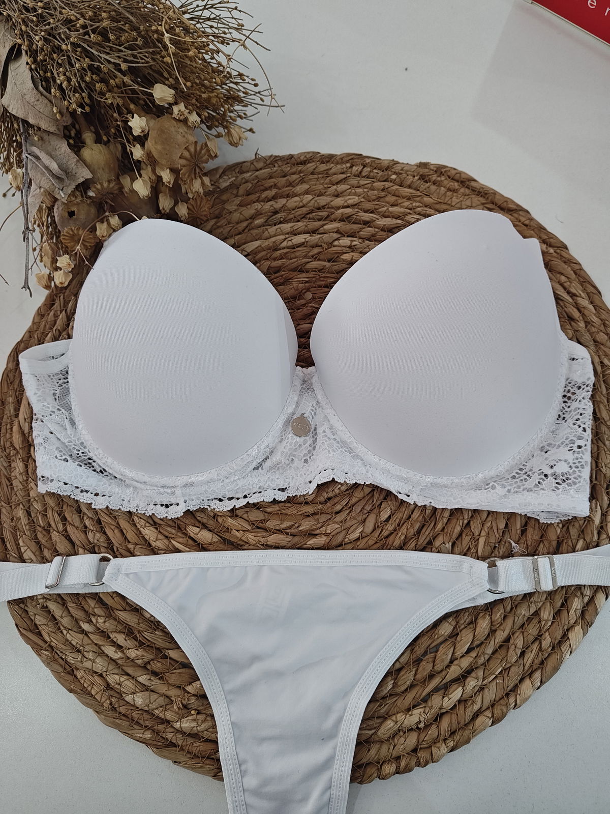 Conjunto de microfibra. Corpiño con taza soft y aro, detalles de encaje. Viene less regulable con bretel ancho