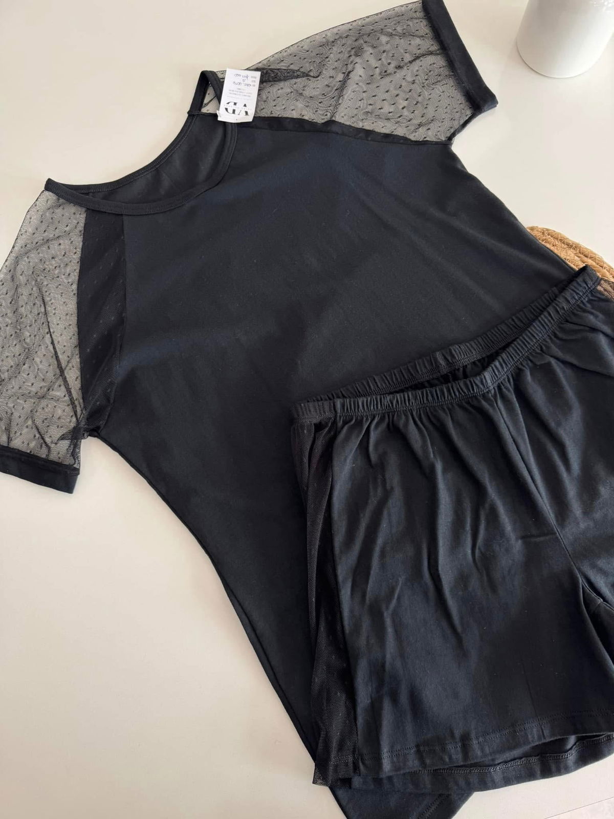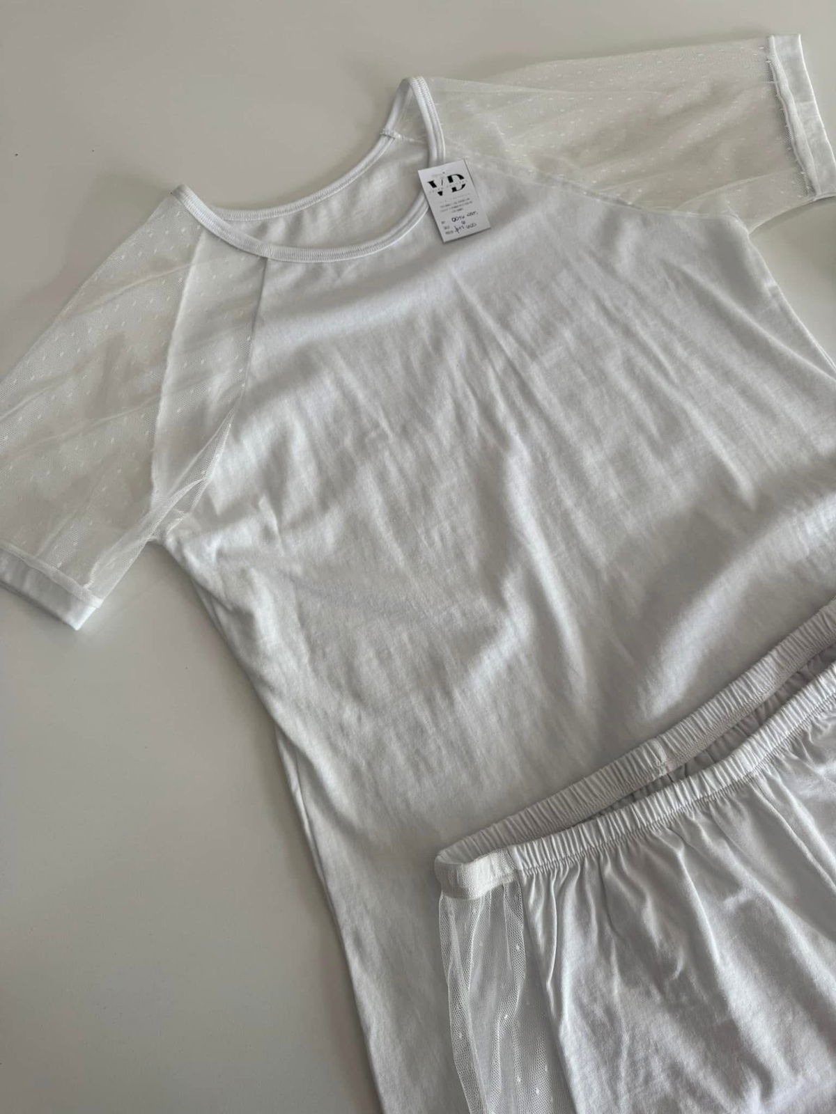 Pijama de dos piezas, remera con detalles de tull en las mangas., y short.